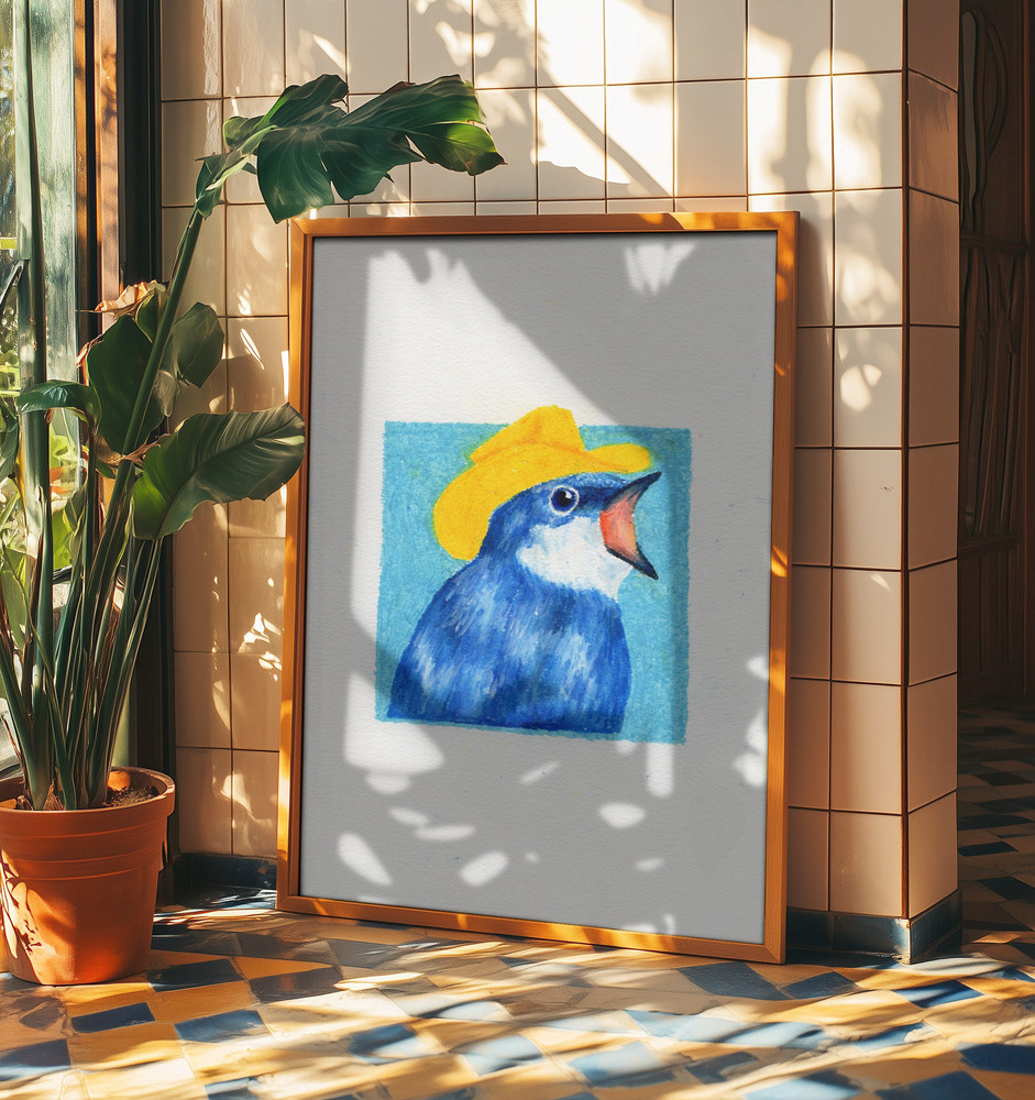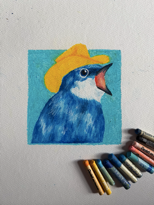Oil pastel study of a pretty and noisy tree swallow wearing a yellow cowboy hat